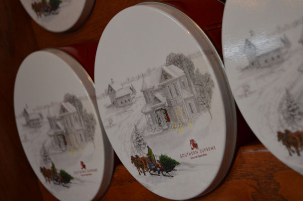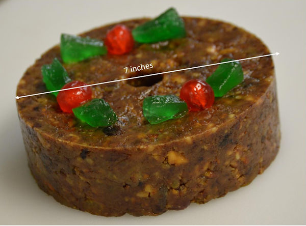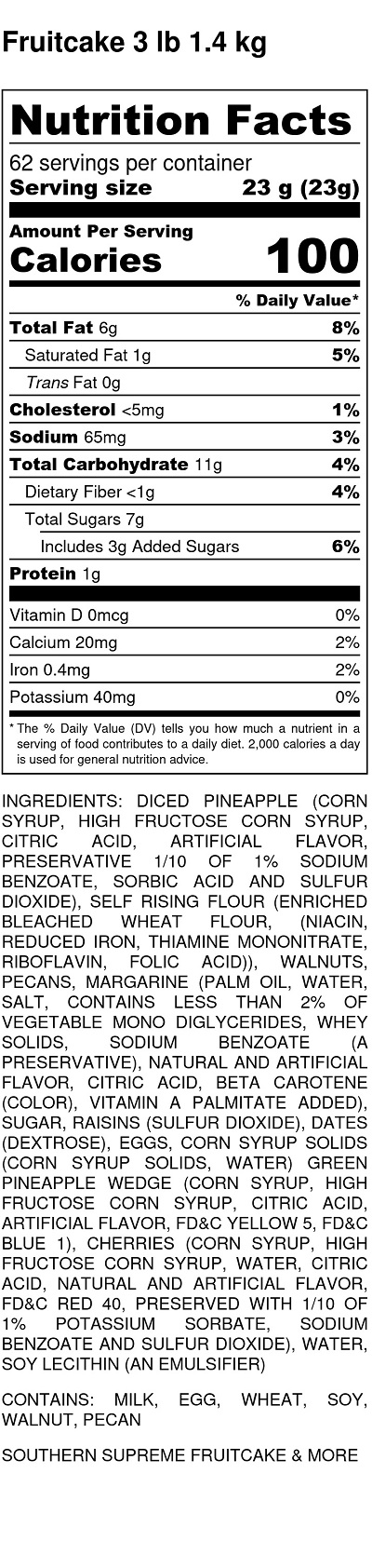| Each fruitcake is hand decorated and beautifully packaged. This isn't just another fruitcake, it's a legacy of a Scott Family tradition. This is the way fruitcake should be. Moist and chewy. Full of nuts. Our old fashioned cake is made in our kitchen with the best of everything a proper fruitcake should have. And, plenty of it too; with rich English walnuts, fresh pecans, golden raisins, dates, pineapple and candied cherries. Each cake is hand decorated and beautifully packaged. This isn't just another fruitcake, it's a legacy of a Scott Family tradition.  This fruitcake measures approximately 7 inches in diameter.  (Tin may vary) |